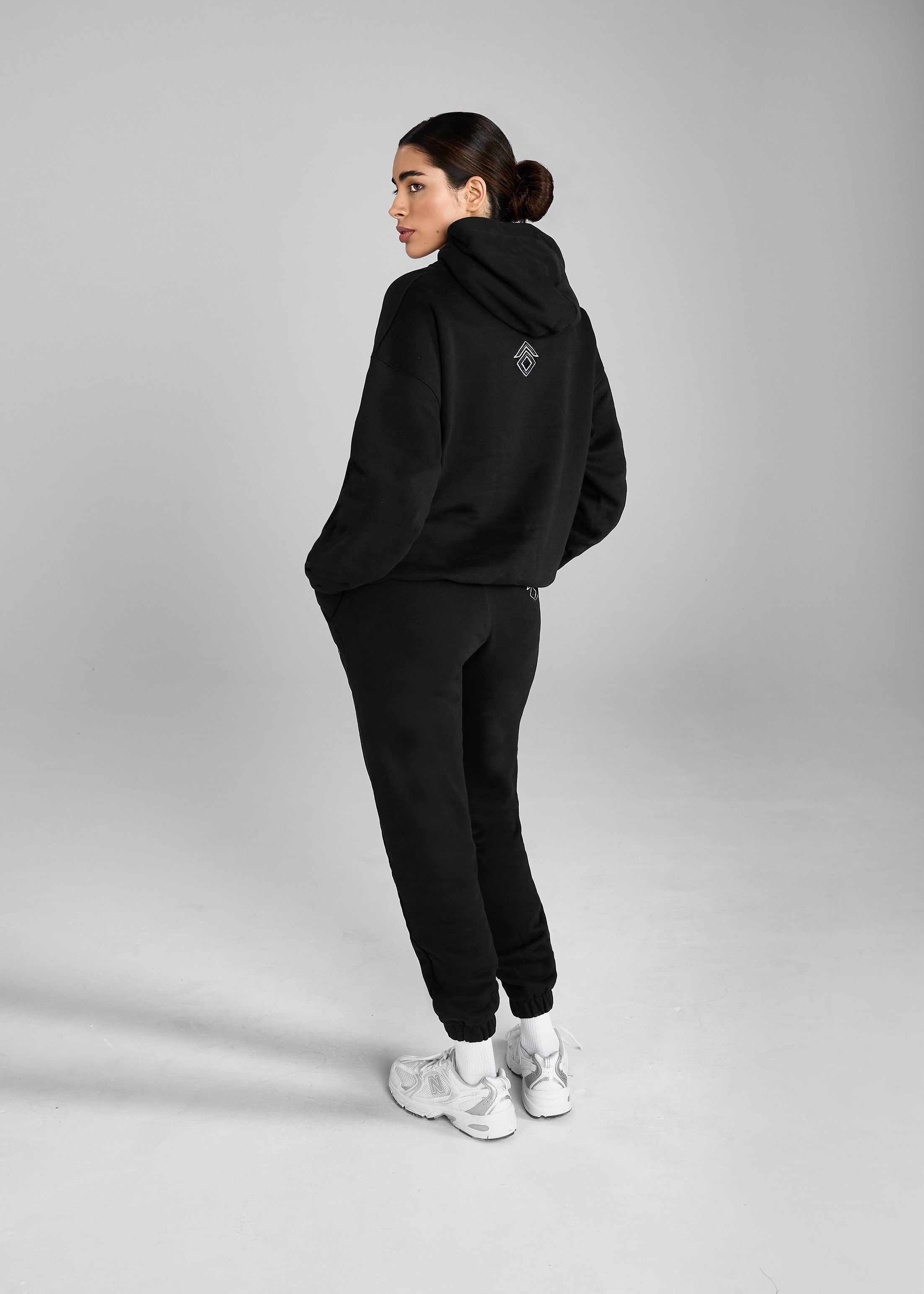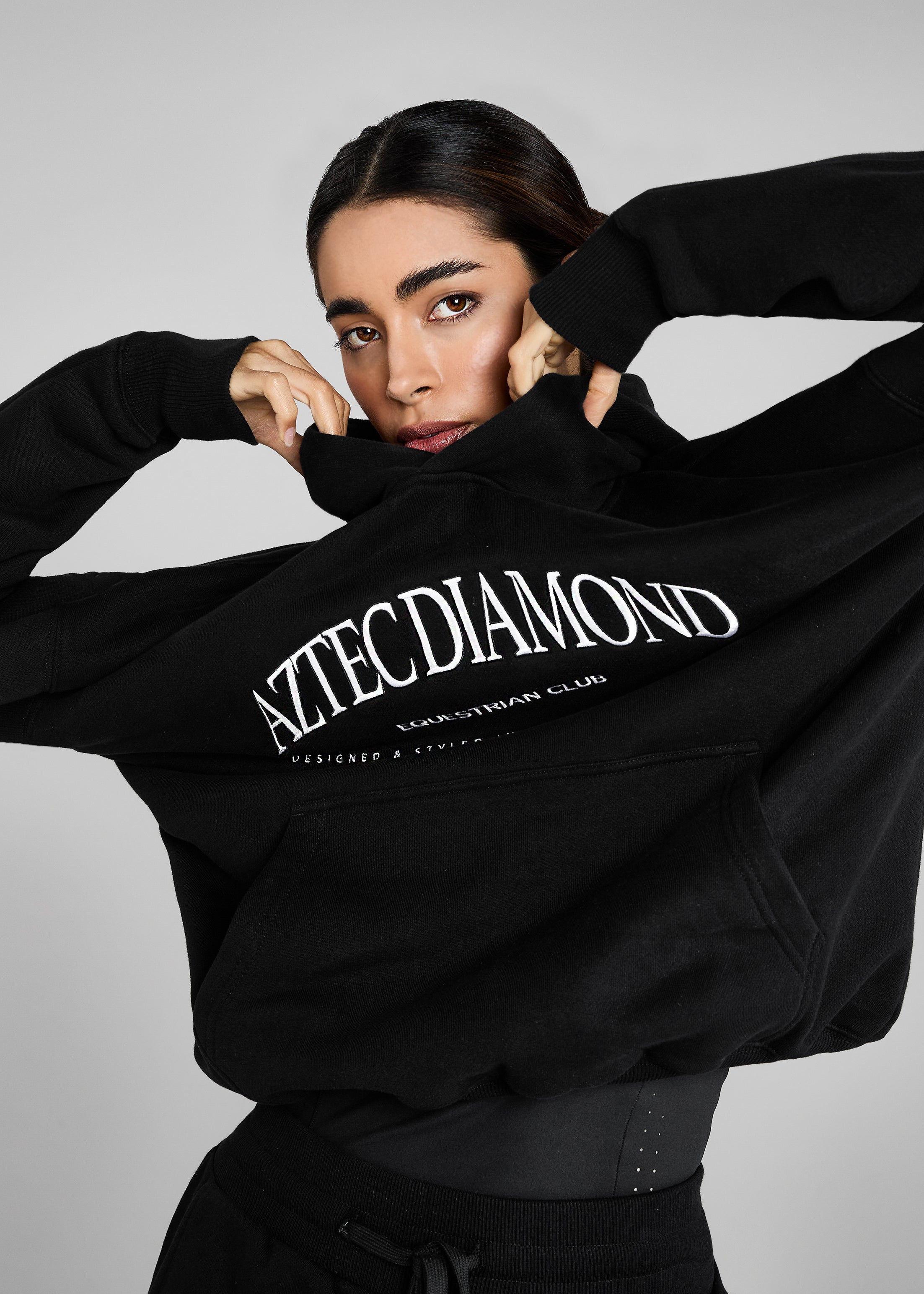 High Quality, soft touch heavyweight cotton jersey fabric Luxury velvet back fabric One hoodie pocket to the front Oversized hood Ribbed waist band & cuffs Large Equestrian Club varsity style embroidery to front 3D chevron logo to back